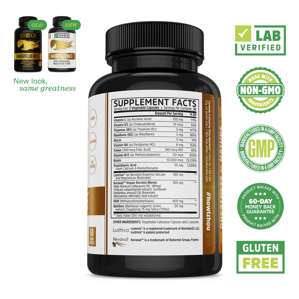 It can be difficult to consume all the nutrients you need from food alone. Hairfluence is designed to supplement the nutrients that support healthy hair growth but may be missing from your diet; like B vitamins, biotin, and collagen. -