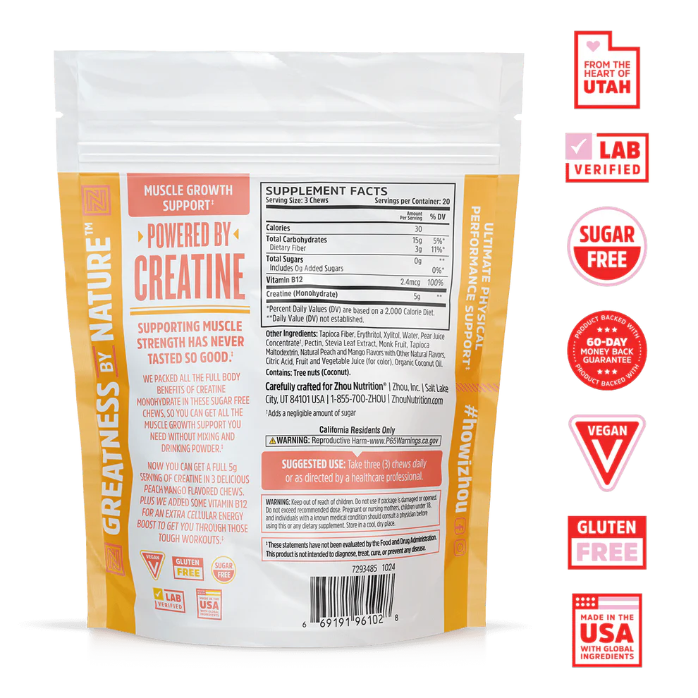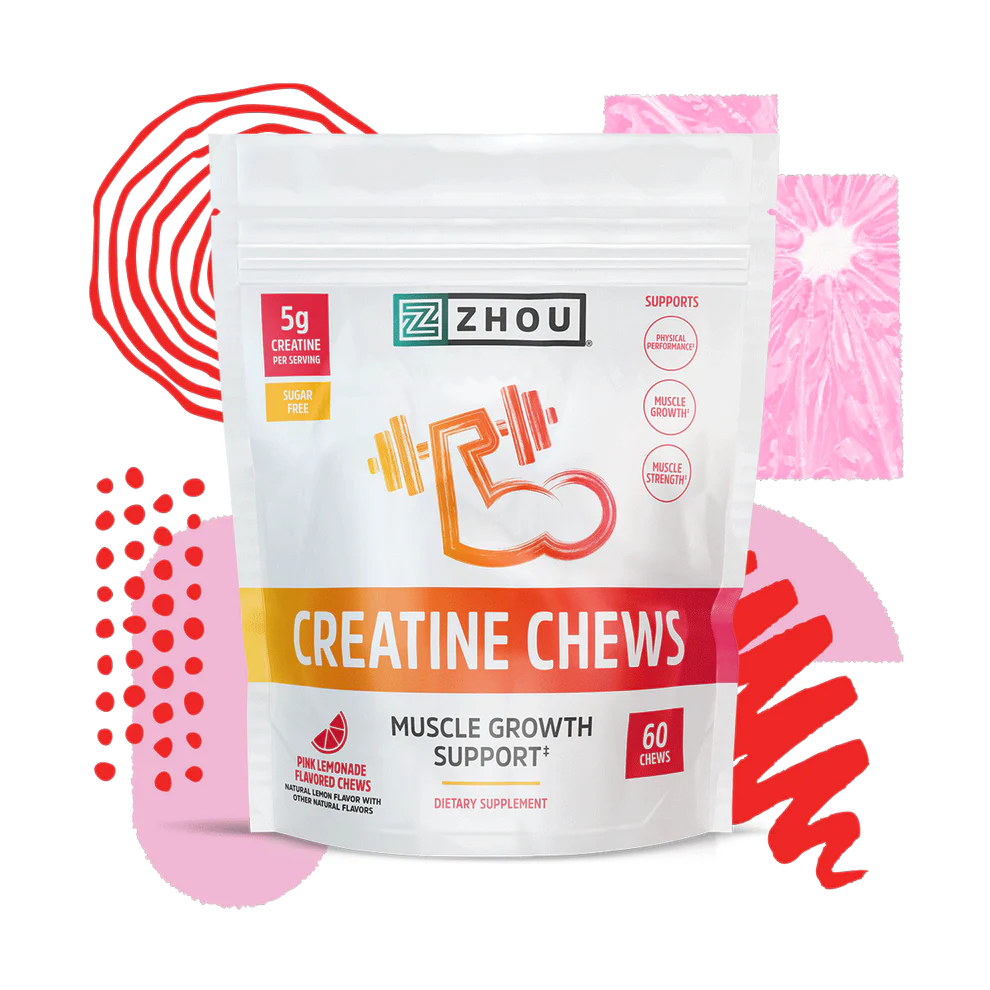 Zhou’s Creatine is made with five grams of creatine monohydrate to help round out everything you need for a complete pre-, during and post-workout stack.* We also added Vitamin B-12 for an extra cellular energy boost.* Creatine Chews have zero sugar and come in a delicious pink lemonade flavor so you get a sweet treat every time you fuel up. They may be bite-sized, but they offer big support for muscle growth.